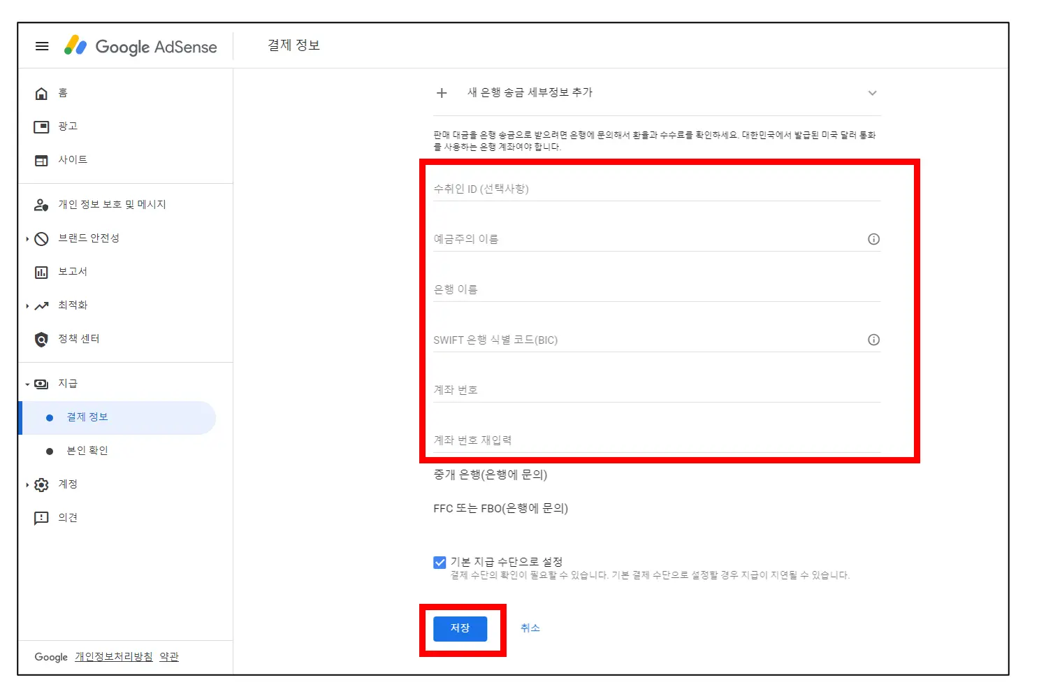- 예금주의 이름: 애드센스 광고 수익을 입금받기 위한 통장의 예금주(본인) 이름을 영문으로 입력