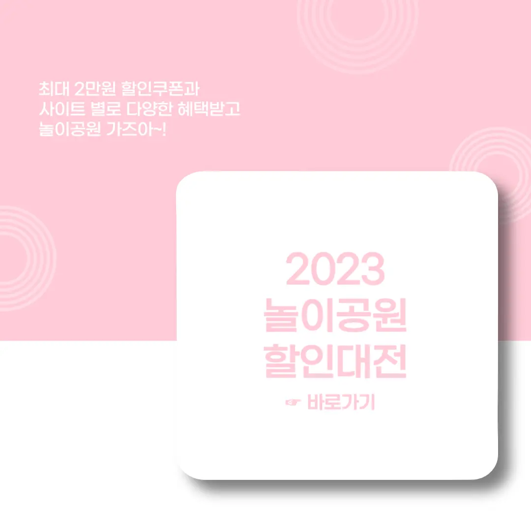 가족, 연인, 친구들과 산과 바다로, 놀이공원으로 놀러 가고 싶은 계절이 되었습니다! 문화체육관광부와 한국관광공사가 5월 31일부터 2023 놀이공원 할인대전을 진행하고 있는데요, 워터파크, 테마파크, 키즈카페 등 전국의 놀이공원 관련 할인 쿠폰을 받으실 수 있습니다!